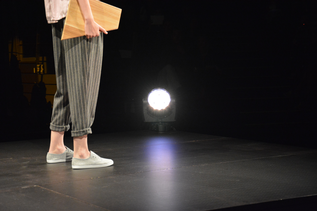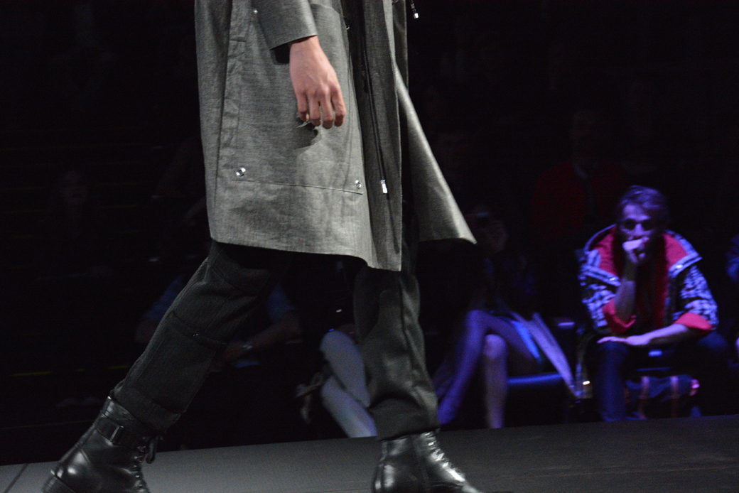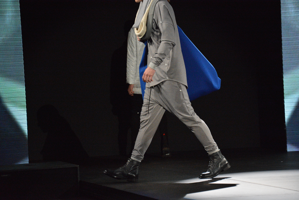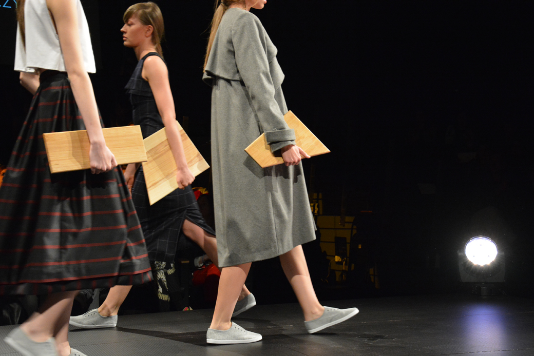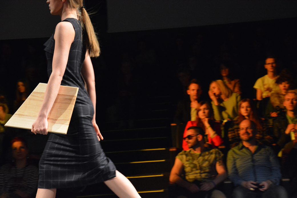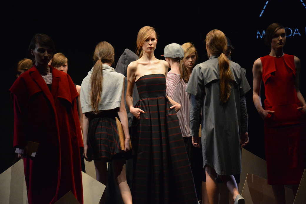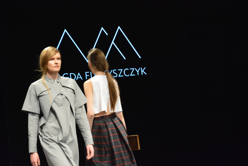 Jak się okazało Studio było mocnym punktem Fashion Weeka, zwłaszcza, że to właśnie tu (wbrew werdyktowi redakcji Elle) można było zrobić prawdziwe odkrycie roku 2014! Na to miano zasłużyła Magdalena Floryszczyk (wcześniej o projektantce pisałam tu: https://kroljestnagi.com/2014/04/08/oto-przyszlosc-polskiej-mody/ ), której debiutancką, bo stworzoną na bazie kolekcji dyplomowej linię cechowały: niezwykła dojrzałość, piękne i przemyślane, choć proste fasony, udany dobór kolorów i dbałość o szczegóły. Tego dnia był to dla mnie pierwszy pokaz (nie mogłam niestety zobaczyć wcześniejszej kolekcji grupy projektowej Mixer) i od razu estetyczna uczta! Floryszczyk pokazała rzeczy, które każdy chciałby mieć i czułby się w nich komfortowo, jednak były to ubrania o klasę wyżej od wyświechtanych już dzianinowych wdzianek oversize. Nie przeszkadzało nawet to, że większość rzeczy utrzymana była w równie mocno wyeksploatowanej szarości. Na pierwszy plan wychodzila bowiem konstrukcja. A zaraz za nią podążały świetnie dobrane, wysokiej jakości tkaniny. W skład inspirowanej baseballem linii „The Game“ weszły luźne minimalistyczne sukienki, proste topy zestawione z rozkloszowanymi spódnicami midi o licznych zakładkach, spodnie, koszule, swetry, kombinezony oraz przepiękne płaszcze. Stylizacje wzbogacały drewniane trapezowe „torebki“ oraz sportowe buty i czapki z daszkiem, które u Floryszczyk umiały zachować klasę, pomimo że kojarzą się raczej z tandetną stylówą dzieciaków z Bronxu. Za nietendencyjne wykorzystanie sportowych odniesień i utrzymanie eleganckiego charakteru kolekcji – ogromny plus!