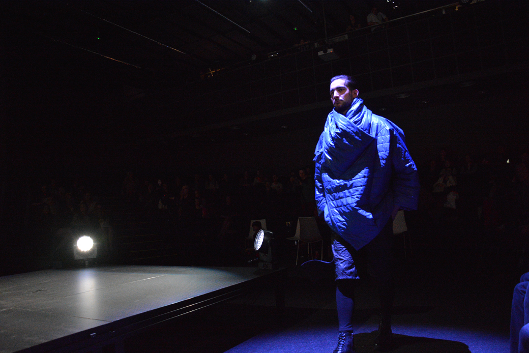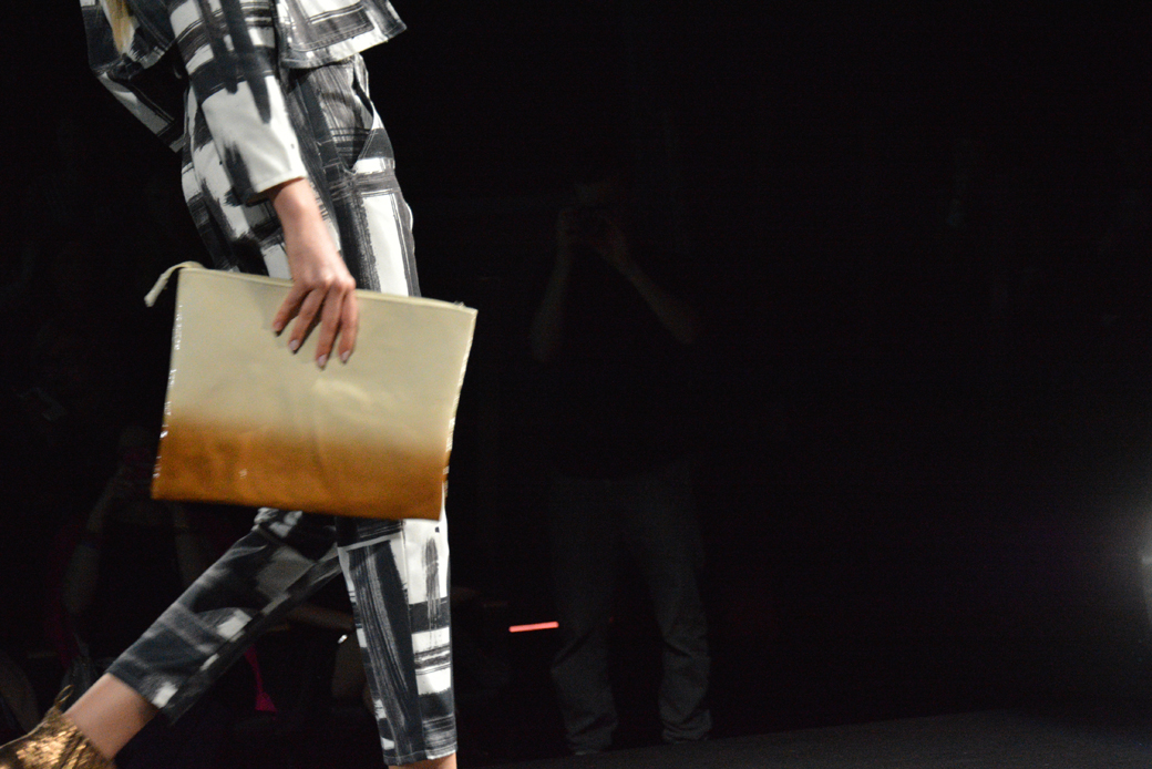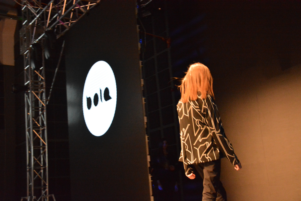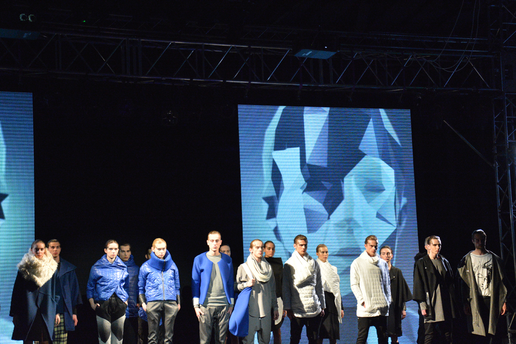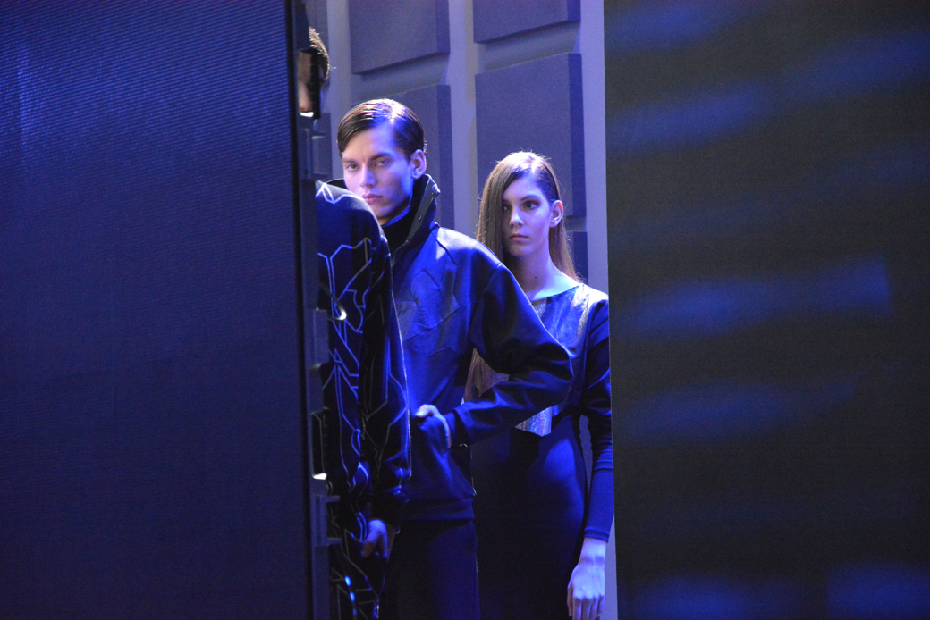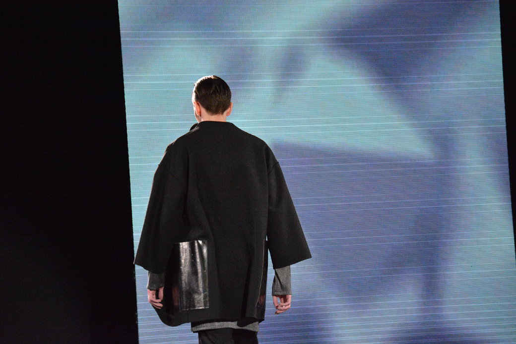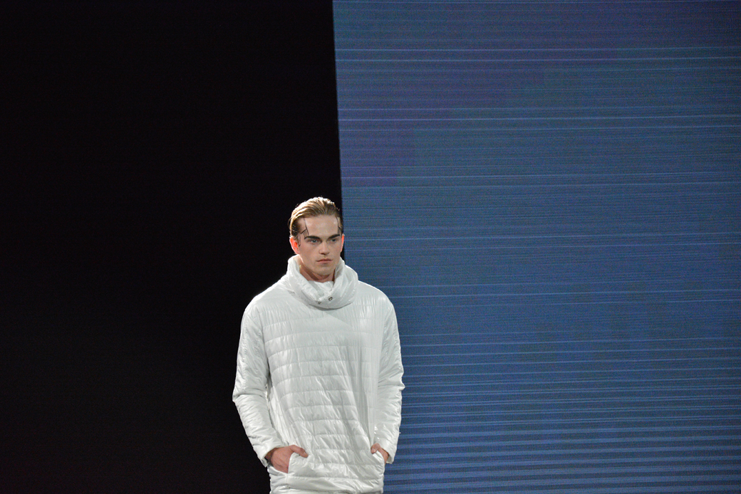 Ostatni pokaz w ramach Studio należał do Jarosława Ewerta. Jego kolekcje miałam okazję widzieć wcześniej, ale na ogół szybko o nich zapominałam. Z tą jest inaczej. Przy tworzeniu linii „FADO“ projektant sięgnął do fascynacji obrazami niczym z kalejdoskopu. Dlatego też punktem wyjścia były dla niego geometryczne formy. Pojawiły się one jeszcze zanim zobaczyliśmy pierwszą sylwetkę, bo już na etapie wprowadzającej w klimat wizualizacji przedstawiającej człowieka (a konkretniej głowę), który pod wpływem płomieni rozpada się na drobne cząstki, by następnie zbudować od nowa. Następnie zaś widzieliśmy je w formie przeskalowanych elementów garderoby – ogromnych prostokątnych kieszeni płaszczy i sukienek, obszernych kominów otulających szyję niczym najcieplejszy szal czy gwiazdy pokazu – wielkiej męskiej torby noszonej na ramieniu. W oczy rzucały się designerskie kurtki puchówki (białe lub kobaltowe), metaliczne – srebrne lub miedziane akcenty strojów, futrzane kamizele oversize narzucone na proste sukienki oraz zrobiony specjalnie na potrzeby pokazu makijaż stworzony na bazie geometrycznych kształtów. Inspiracja, choć wyrazista, nie przytłaczała jednak.