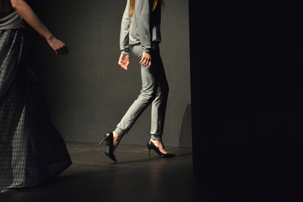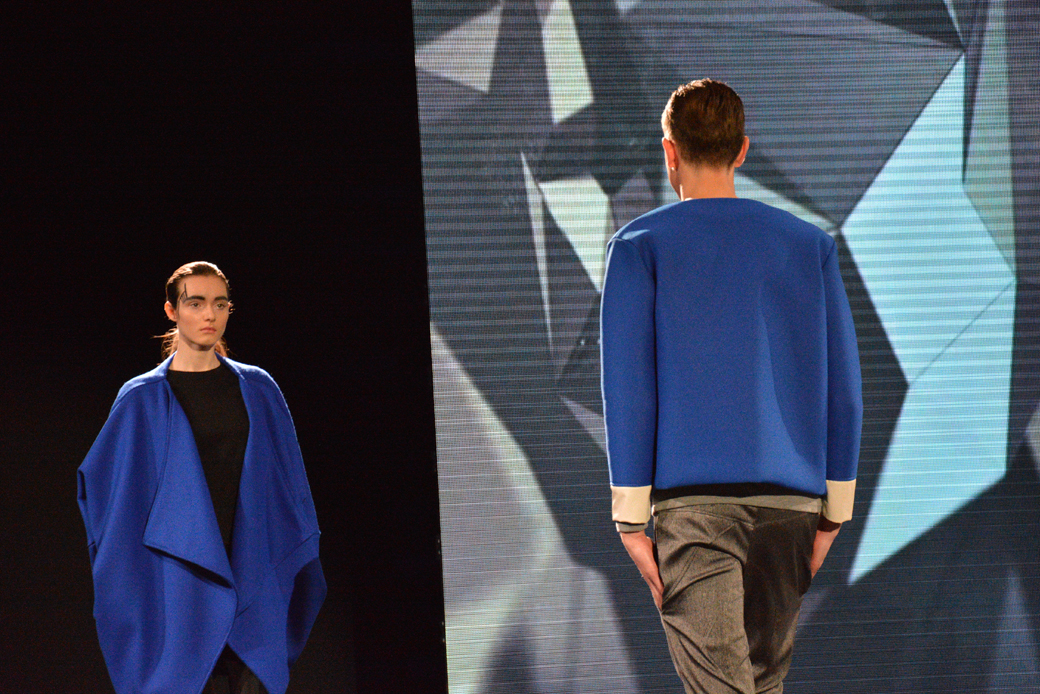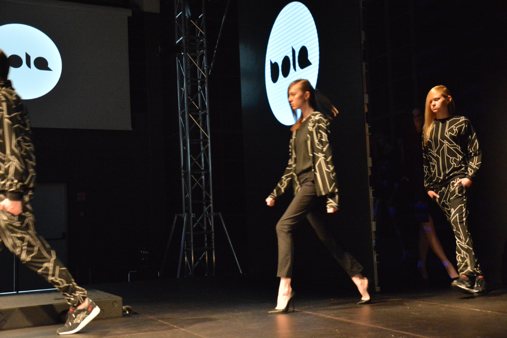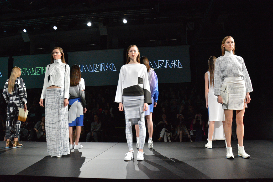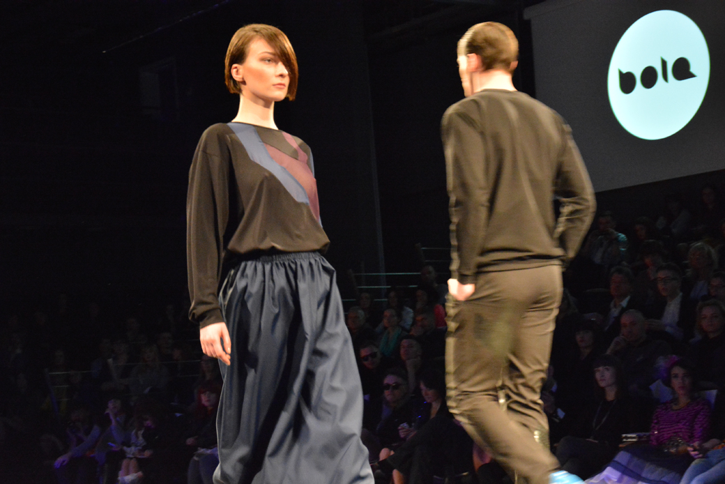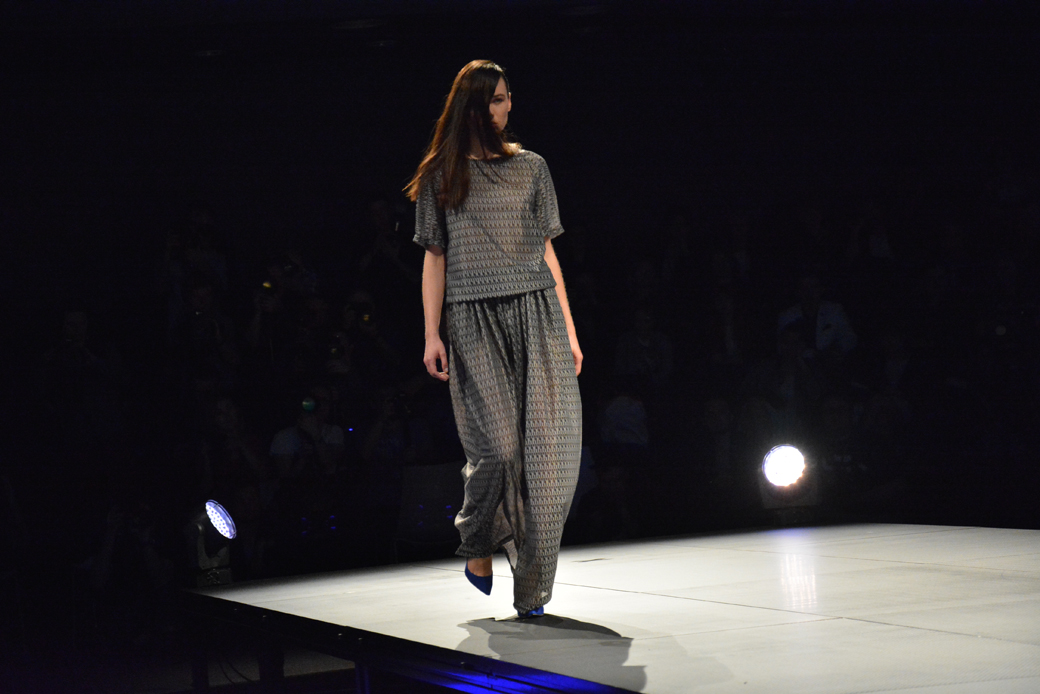 Oli Bajer (stojącej za marką Bola), czyli autorce kolejnej zaprezentowanej lini, udało się to nieco gorzej. Bo ona także sięgnęła po inspiracje sportowe (to zresztą jeden z głównych trendów powtarzających się podczas tegorocznego Tygodnia Mody – a mówiąc szczerze, nie tylko tegorocznego…), próbując zestawić je z formalnymi elementami stroju. W rezultacie modelki ubrane w dopasowane eleganckie spodnie i marynarki przechadzały się obok tych w bluzach i legginsach… Graficzne i geometryczne nadruki, choć efektowne, dawno już widzieliśmy. Także fasony nie wnosiły niczego nowego. Kolekcja poprawna i udana kolorystycznie (czerń, granat i fiolet ożywione srebrem) nie powaliła więc, choć pod względem formalnym nie można jej nic zarzucić.