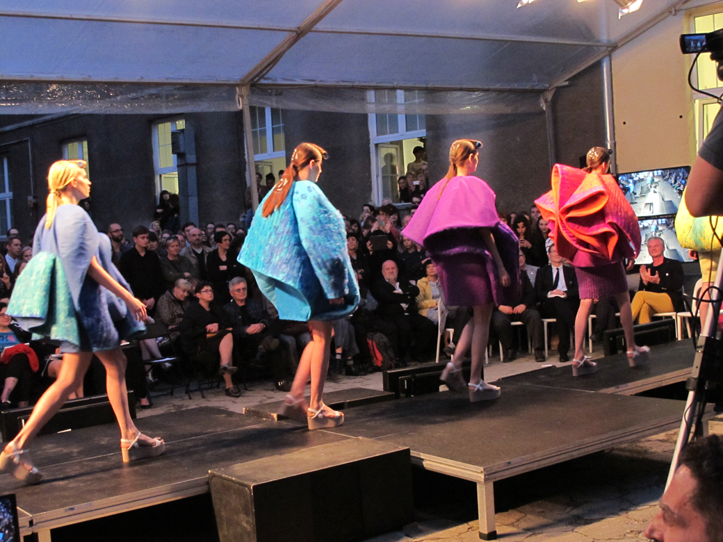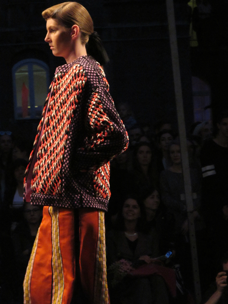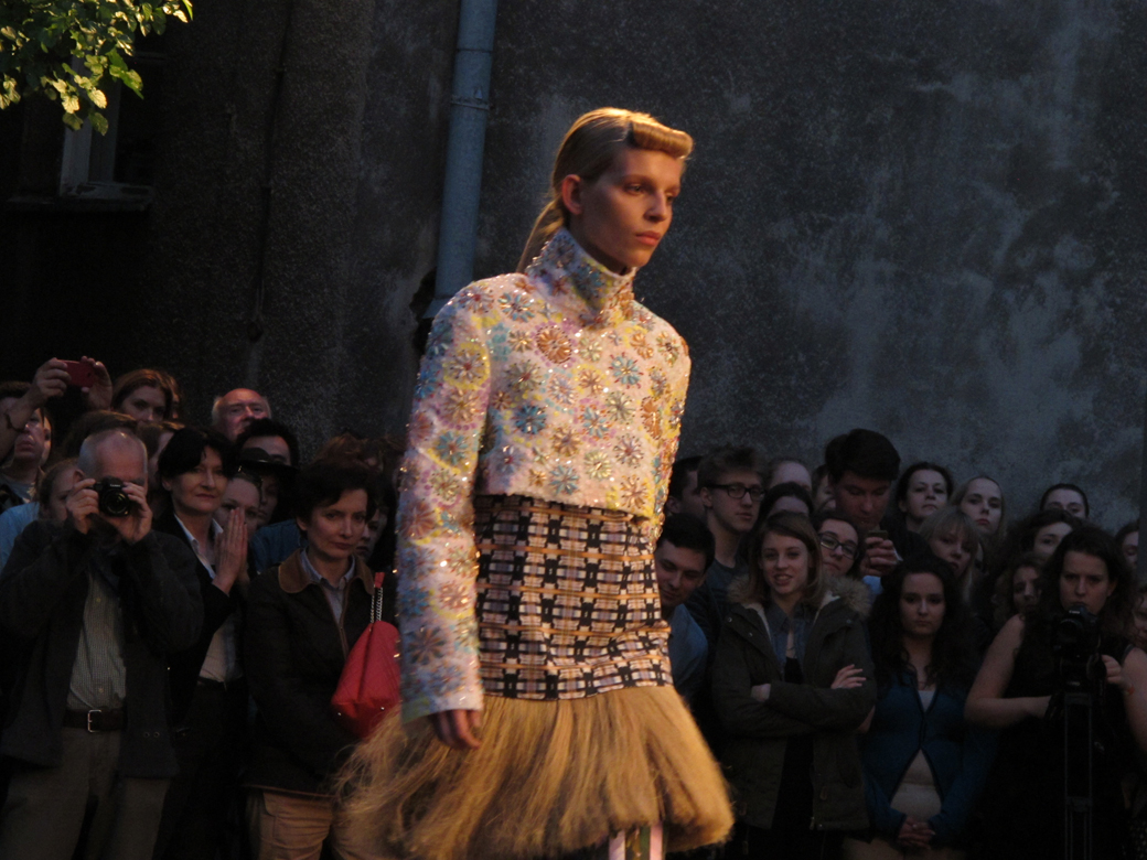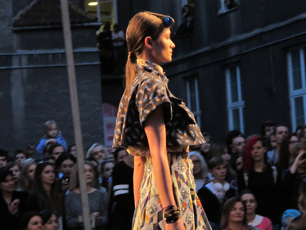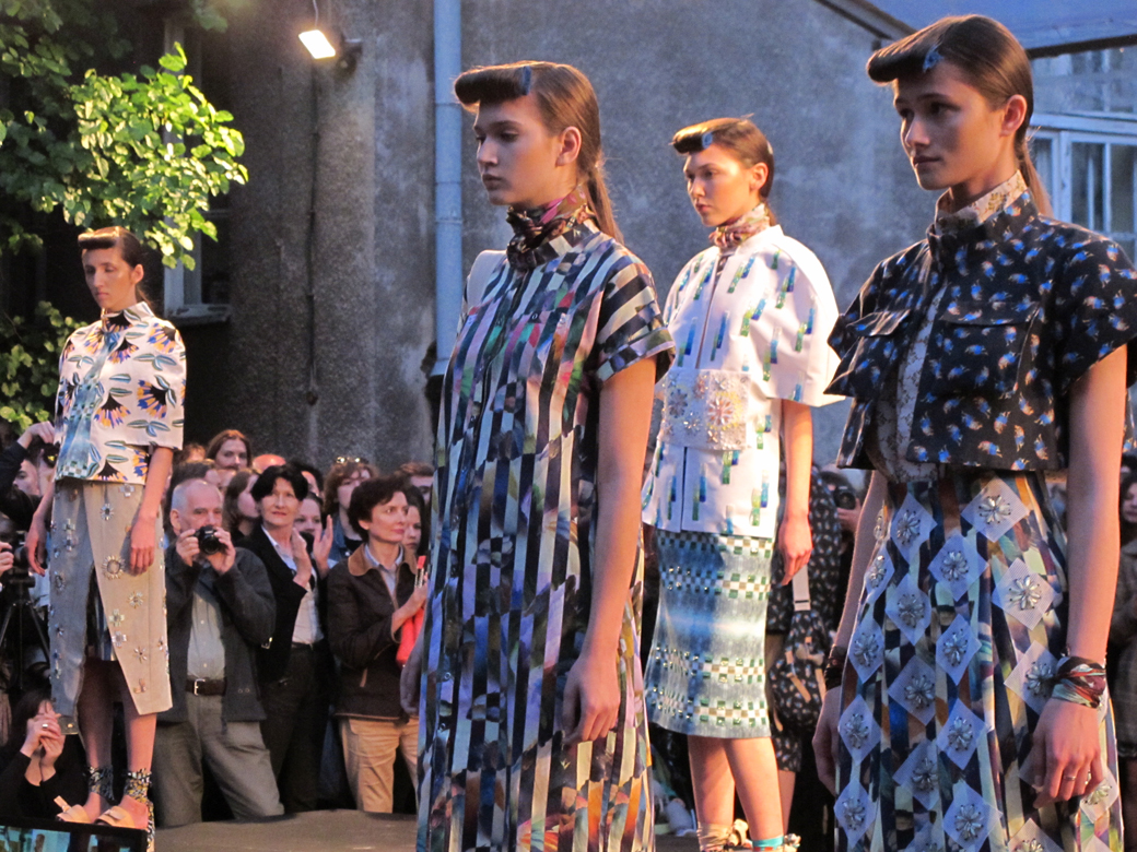 Tak dużego stężenia dobrej mody nie doświadczyłam już dawno. Zwłaszcza w wydaniu uczelnianym. Widać, że studenci Katedry Mody nie lubią i nie chcą się ograniczać. Przynajmniej w kwestii stosowania środków artystycznego wyrazu. Trudno zdecydować się, co w zaprezentowanych podczas pokazu dyplomowego kolekcjach wychodzi na pierwszy plan. Czy multikolorowe wzorzyste strukturalne tkaniny (tak, tak – wszystkie te cechy występują razem!) czy licznie pojawiające się akcenty dekoracyjne – biżuteryjne aplikacje, plastikowe naszywki o geometrycznych kształtach albo grube frędzle z włosia. A może formy – wyraźnie zaznaczone i oryginalne, bazujące na przeskalowanych elementach? Tu liczy się wszystko – od konstrukcji, przez wybór tkanin i kolorów aż po detale. Każdy szczegół jest przemyślany. Nie ma miejsca na przypadkowe rozwiązania. Wreszcie pojawia się kolor, który, miejmy nadzieję, niebawem wybije się na tle nadużywanej przez polskich projektantów szarości. Ubrania – nawet pojedyncze modele – uszyte są z kilku tkanin o różnorodnych wzorach i w kontrastowych odcieniach. A ich zestawienia, choć odważne, są bez zarzutu. Widać, że to kierunek, który obrała uczelnia, tym samym wyróżniając się pośród innych obecnych w Polsce. Ale warto z tym uważać – silny i bardzo czytelny styl szkoły nie powinien zagłuszać tożsamości pojedynczych projektantów. A podczas ostatniego – i pierwszego w historii Akademii – pokazu, nieco upraszczając, mniej uważny widz mógłby nie spostrzec, gdzie kończy się jedna kolekcja, a zaczyna druga. Oto one.