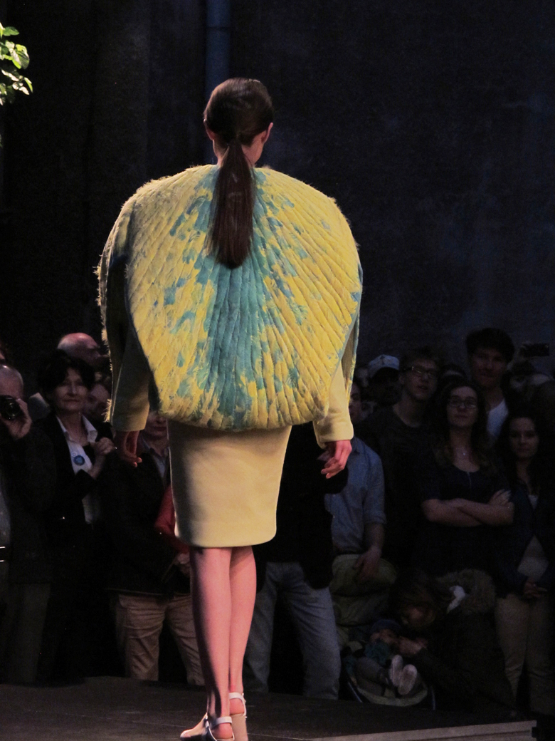 Jevgenija Jurkievica poszła na całość, poszukując form. Choć nie zapomniała też o przyciągających wzrok kolorach. W skład kolekcji wywołującej skojarzenia z podwodną fauną i florą weszły suknie-instalacje złożone z przeskalowanych elementów mocno odstających od ciała. Takie linie to ostatnio rzadkość, bo niewielu projektantów chce robić coś, czego nie da się łatwo sprzedać. Jednak dopiero gdy mają je w swoim portfolio, są w stanie kreatywnie myśleć o konstrukcji stroju. Także takiego o charakterze komercyjnym.