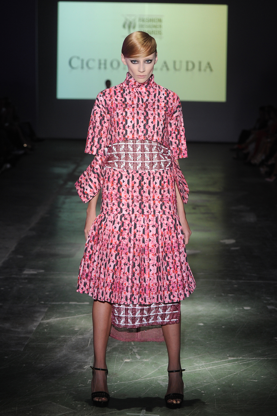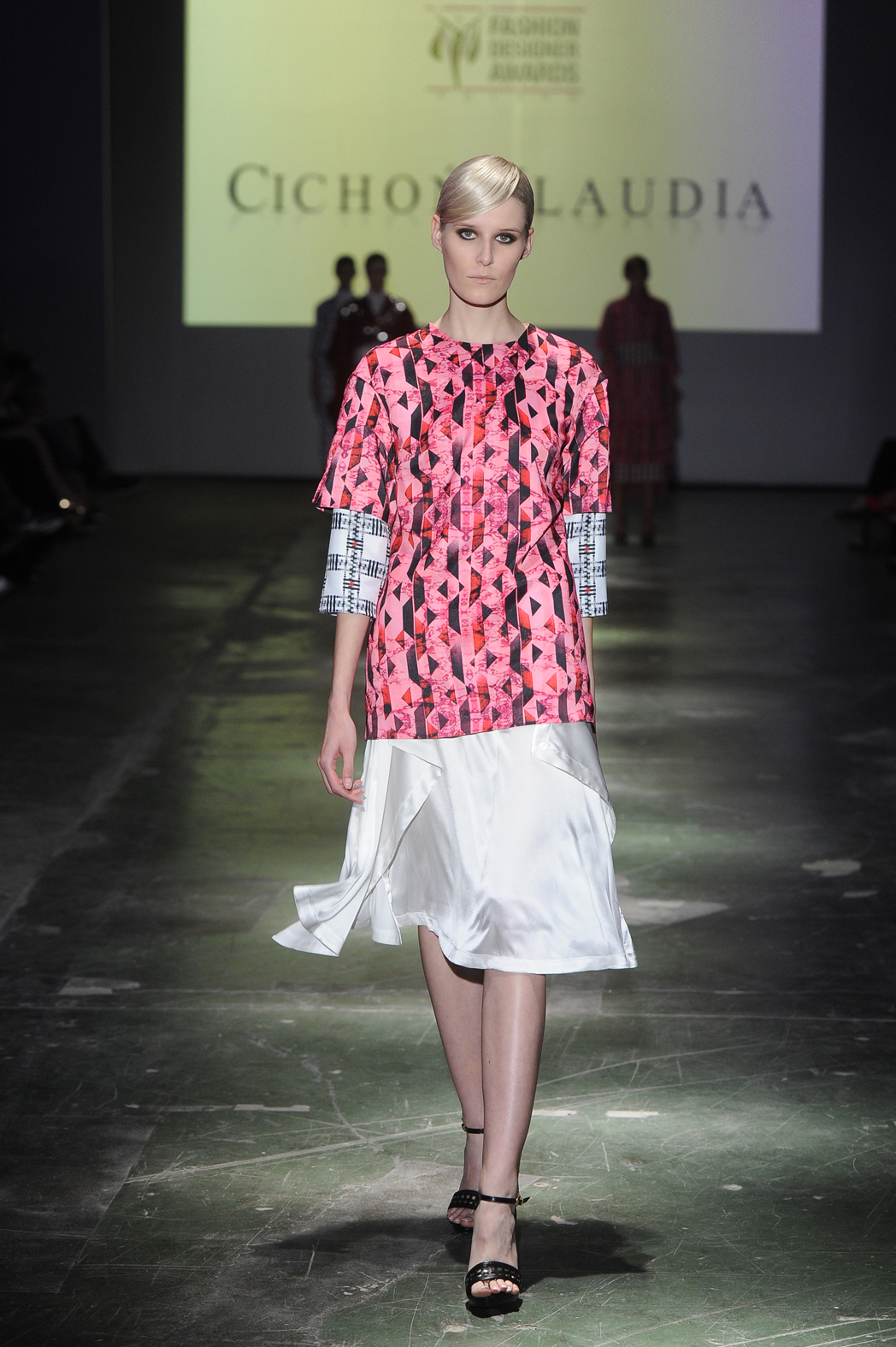 Trzecie miejsce zajęła Klaudia Cichoń. Jej kolekcja była najbardziej odważna i spektakularna, bo uszyta z wzorzystych tkanin głównie w odcieniach różu i czerwieni (z akcentem granatowym i białym). Ubrania były ciekawe nie tylko kolorystycznie, ale i konstrukcyjnie. Wystarczy spojrzeć na komplet ze spodniami albo trójkątne wycięcia choćby na rękawach czerwonej marynarki obszytej srebrnymi aplikacjami.