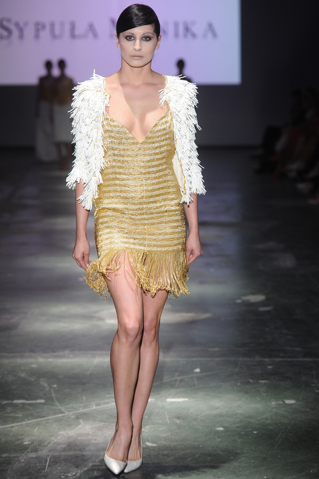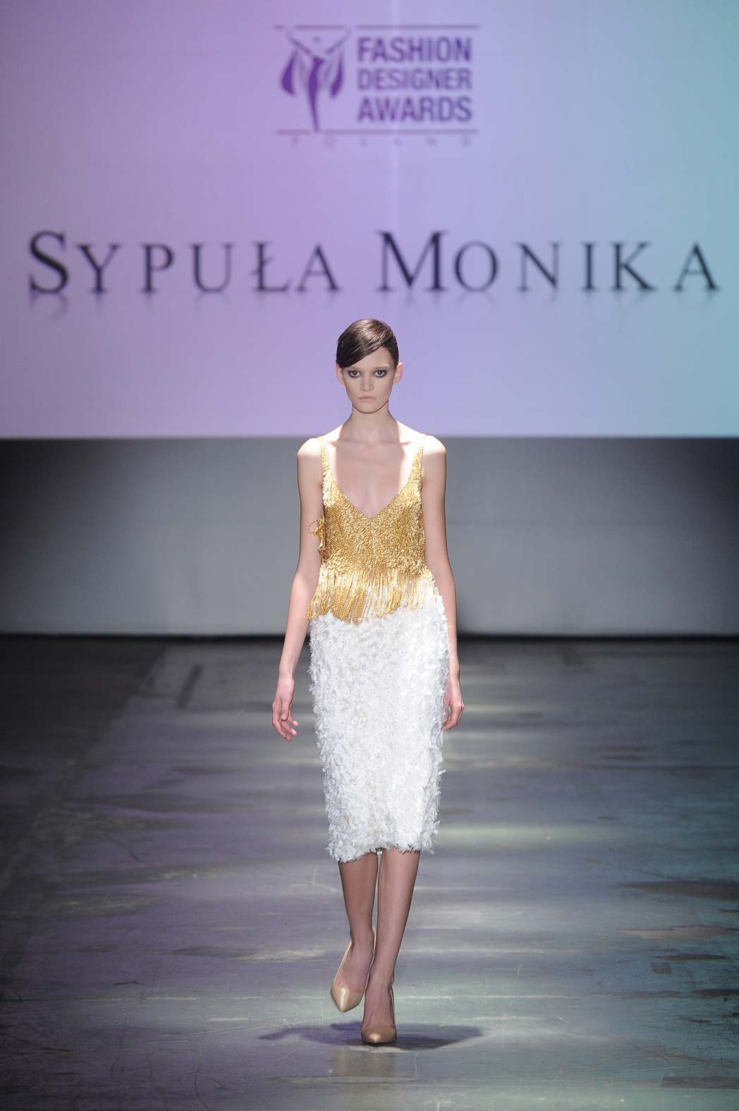 Mało odkrywcze, ale pełne nieodpartego uroku były też według mnie kreacje (kreacje, bo w klimacie imprezowym) Moniki Sypuły. Złotym mięsistym tkaninom nie groził efekt nadmiernej ciężkości, dzięki zestawieniu z bielą lub z elementami siatkowymi. Kroje, mimo że przewidywalne, były jednak wdzięczne, bo kobiece – odsłaniające sporo, ale ze smakiem (i po to by dodać lekkości).