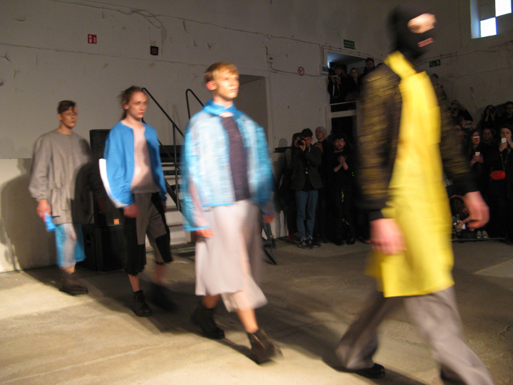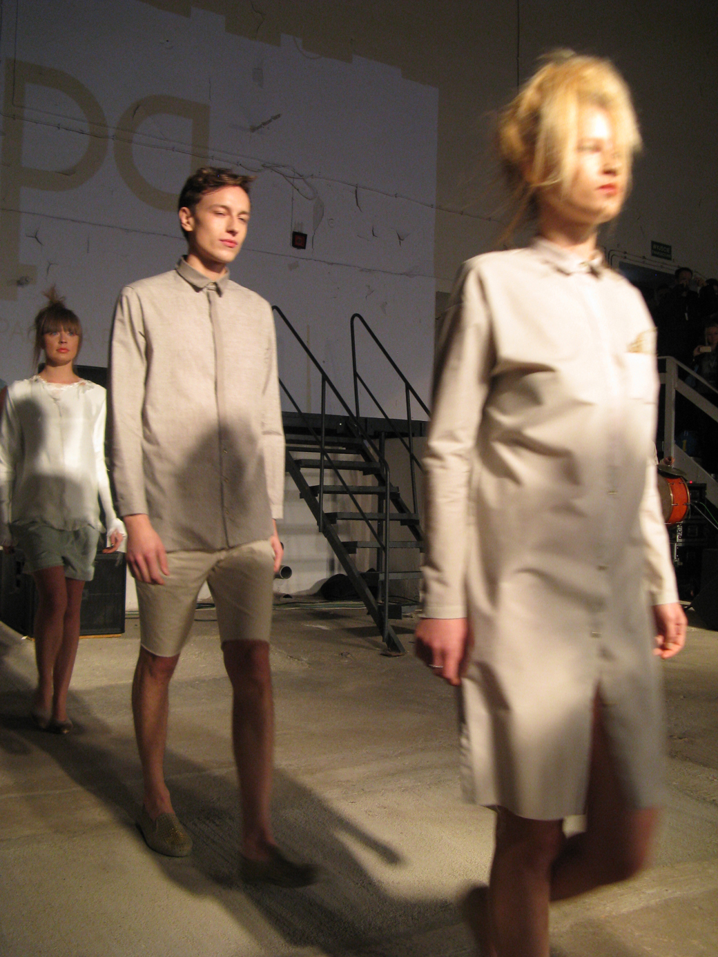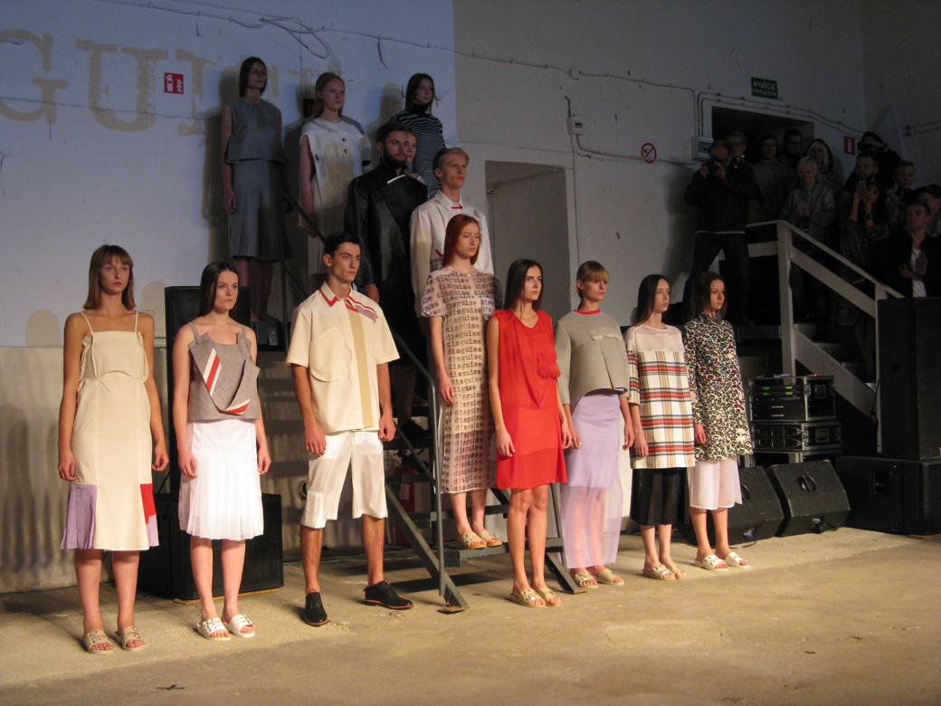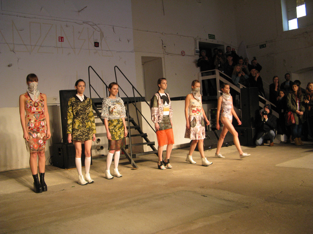 Choć założyciel marki – Maksymilian Gorockiewicz – jest dopiero studentem drugiego roku projektowania na łódzkiej ASP, cechuje go dojrzałość myślenia o kolekcji i jej promowania (świetne zdjęcia wizerunkowe miałam okazję zobaczyć podczas obrad Rady Programowej strefy OFF). Kolekcja mimo że bogata w inspiracje i środki artystycznego wyrazu, nie sprawiała wrażenie nimi przeładowanej. Tworzona jakby z myślą o współczesnych buntownikach, a nawet rewolucjonistach – wykorzystywała motyw rewolweru – powtarzający się w formie haftów i nadruków, nawiązywała do odzieży militarnej (bogactwo pakownych kieszeni) i stylu grunge (niewykończone koszule i dżinsowe kamizele). Mocne, typowo męskie elementy garderoby występowały jednak w zestawieniach z plisowanymi spódnicami czy prześwitującymi, siateczkowymi bluzami. Ciekawe było np. połączenie kurtki bomberki i plisowanego płaszcza. Plus za intensywne kolory – żółty i niebieski oraz udany dobór różnorodnych tkanin.