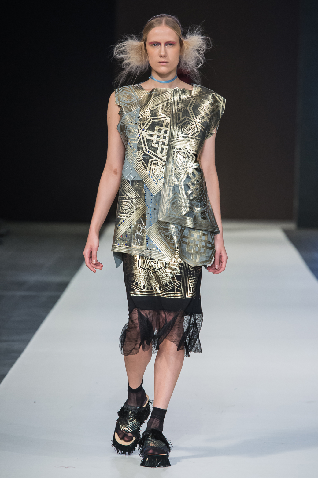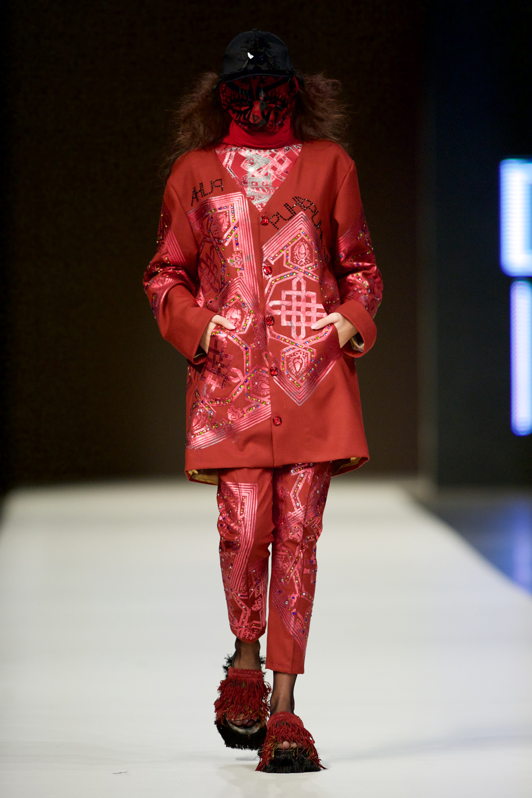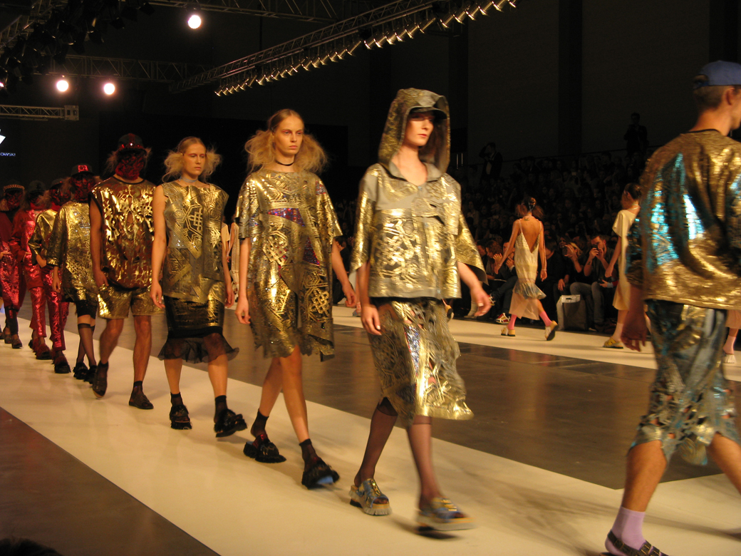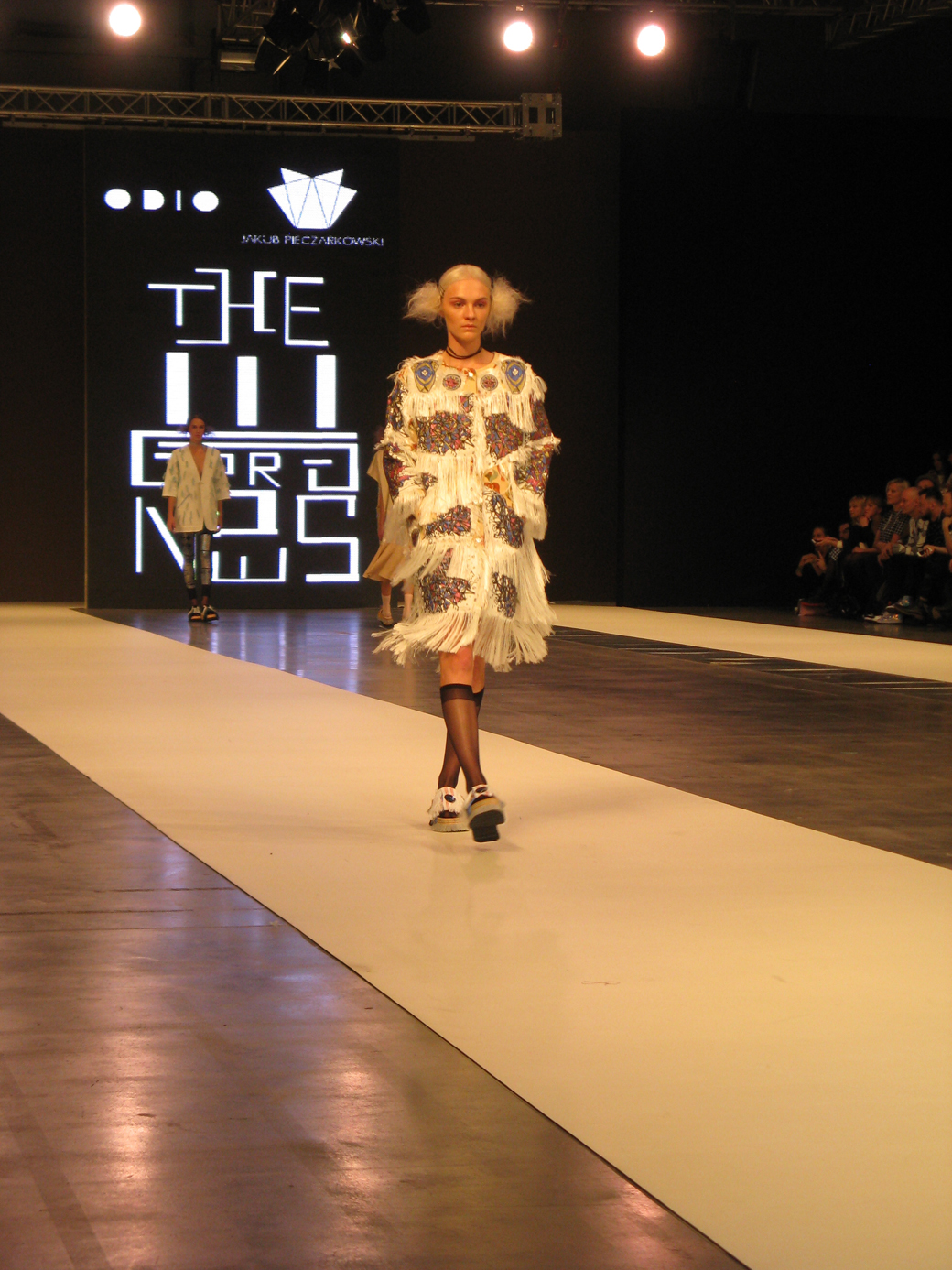 Znacie? Kto by nie znał. Odkąd ten duet po raz pierwszy zaprezentował swoją kolekcję podczas łódzkiego fashion weeka, kolejne pokazy są jednymi z najbardziej wyczekiwanych punktów imprezy. Nic dziwnego, na wybiegu się dzieje. Wszystkiego jest w bród. Po pierwsze – samych ubrań, po drugie – kolorów, blasku, warstw, detali. Kicz? Na granicy, ale zawsze wychodzą obronną ręką. Tym razem Odio i Pieczarkowski stworzyli spektakularną kolekcję, w której da się rozróźnić trzy linie stylistyczne na tyle jednak powiązane, by spójność całości nie została zaburzona. Pierwsza z nich to przede wszystkim pastelowe romantyczne sukienki – nie dajcie się jednak zmylić, wcale nie były cukierkowe i słodkie. Warstwowe, uszyte z wielu kawałków różnorodnych tkanin i postrzępione budziły skojarzenie raczej ze strojem Ofelii niż Miss America. Wśród nich znalazły się te bardziej bogate we frędzle (czy to nawiązanie do tradycyjnych strojów mieszkanek Ameryki Południowej?) albo o sportowym charakterze (kołnierzyki jak przy bomber jacket, obniżona linia bioder niczym w sukienkach do tenisa etc.). Zdobiły je nie tylko dobrze połączone kolory, ale i błyszczące aplikacje układające się w napisy – hasła. Linia druga – złota – definicja przepychu. I podróż w czasie do Bizancjum. Ubrania tworzące total looki o szlachetnym blasku pokrywały historyczne motywy i bogate nadruki. Gdzieniegdzie pojawiały się wycięte fragmenty tkaniny tworzące ażurowe wzory, inne wypełniały koraliki układające się w mozaikę. Pokaz zamykała linia czarno-czerwona. Budząca grozę, bo modele ubrani w zadrukowane czarne stroje mieli twarze zakryte czerwonymi chustami z namalowani oczami. O co walczą ci bojownicy? Nie wiadomo. Może na trop naprowadzą słowa Eurypidesa: „Kogo Bóg chce zgubić, temu rozum odbiera“ – jedyne, co można było przeczytać w opisie kolekcji przygotowanym przez projektantów dla publiczności – w dodatku po łacinie.