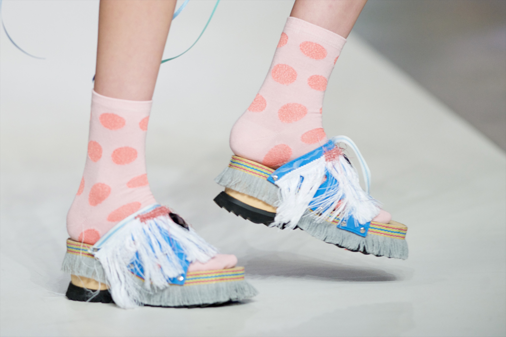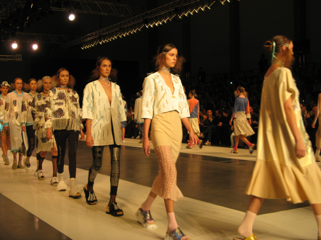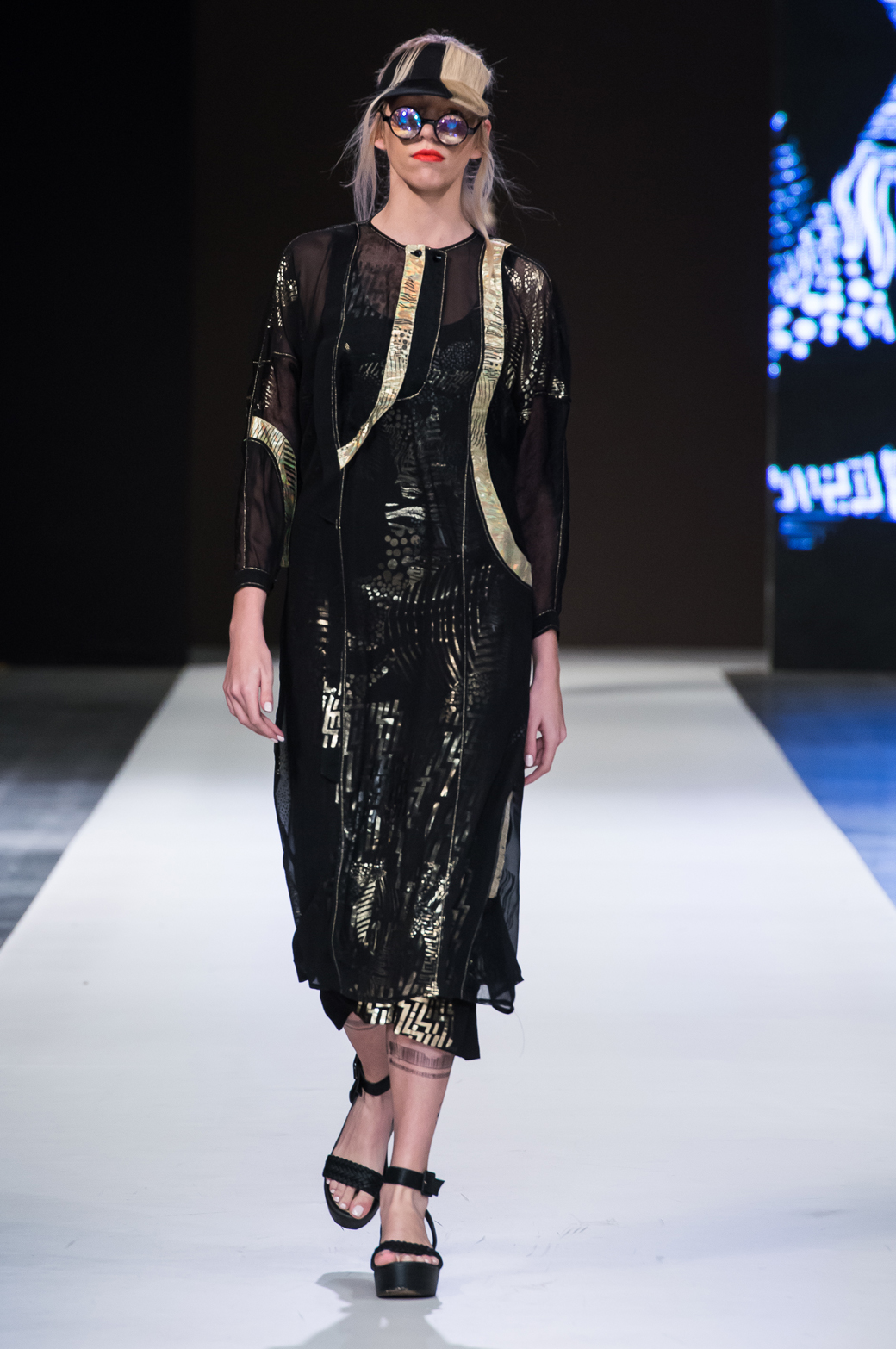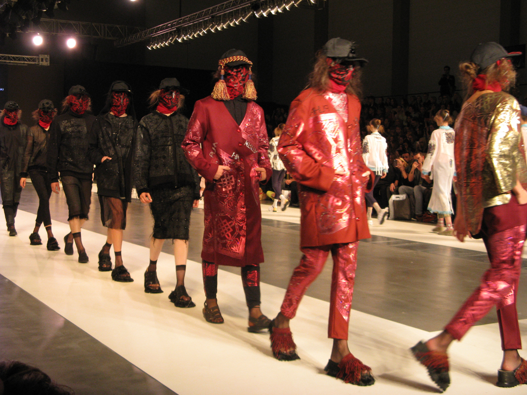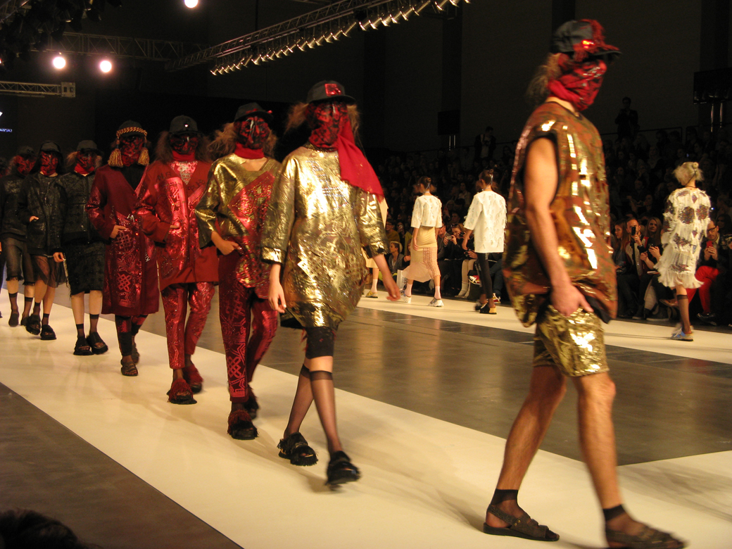 Znacie? Kto by nie znał. Odkąd ten duet po raz pierwszy zaprezentował swoją kolekcję podczas łódzkiego fashion weeka, kolejne pokazy są jednymi z najbardziej wyczekiwanych punktów imprezy. Nic dziwnego, na wybiegu się dzieje. Wszystkiego jest w bród. Po pierwsze – samych ubrań, po drugie – kolorów, blasku, warstw, detali. Kicz? Na granicy, ale zawsze wychodzą obronną ręką. Tym razem Odio i Pieczarkowski stworzyli spektakularną kolekcję, w której da się rozróźnić trzy linie stylistyczne na tyle jednak powiązane, by spójność całości nie została zaburzona. Pierwsza z nich to przede wszystkim pastelowe romantyczne sukienki – nie dajcie się jednak zmylić, wcale nie były cukierkowe i słodkie. Warstwowe, uszyte z wielu kawałków różnorodnych tkanin i postrzępione budziły skojarzenie raczej ze strojem Ofelii niż Miss America. Wśród nich znalazły się te bardziej bogate we frędzle (czy to nawiązanie do tradycyjnych strojów mieszkanek Ameryki Południowej?) albo o sportowym charakterze (kołnierzyki jak przy bomber jacket, obniżona linia bioder niczym w sukienkach do tenisa etc.). Zdobiły je nie tylko dobrze połączone kolory, ale i błyszczące aplikacje układające się w napisy – hasła. Linia druga – złota – definicja przepychu. I podróż w czasie do Bizancjum. Ubrania tworzące total looki o szlachetnym blasku pokrywały historyczne motywy i bogate nadruki. Gdzieniegdzie pojawiały się wycięte fragmenty tkaniny tworzące ażurowe wzory, inne wypełniały koraliki układające się w mozaikę. Pokaz zamykała linia czarno-czerwona. Budząca grozę, bo modele ubrani w zadrukowane czarne stroje mieli twarze zakryte czerwonymi chustami z namalowani oczami. O co walczą ci bojownicy? Nie wiadomo. Może na trop naprowadzą słowa Eurypidesa: „Kogo Bóg chce zgubić, temu rozum odbiera“ – jedyne, co można było przeczytać w opisie kolekcji przygotowanym przez projektantów dla publiczności – w dodatku po łacinie.