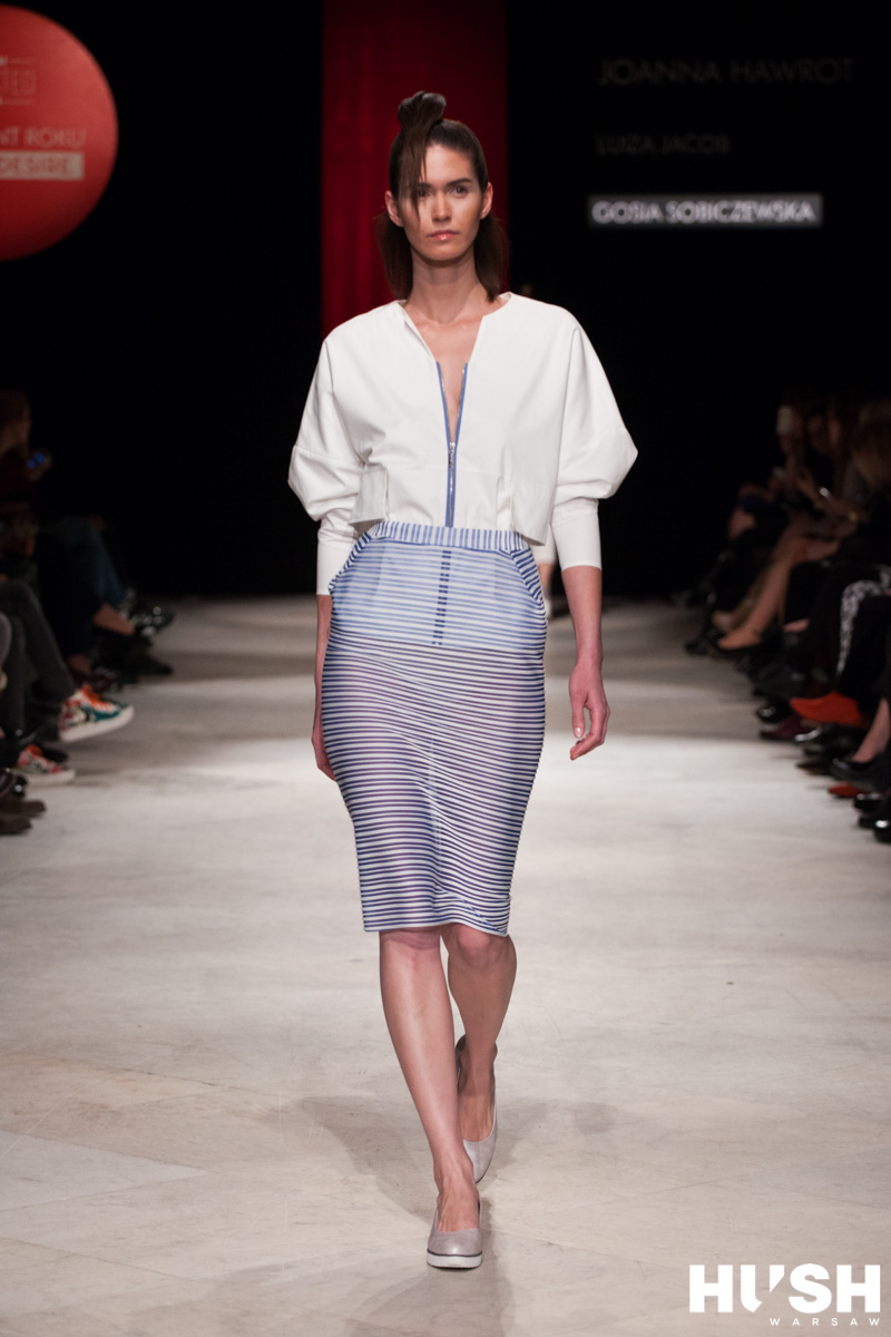 W projektach „Est by eS.“ drzemie duża dawka kobiecości i seksapilu – przemycone są one jednak w sposób bardzo subtelny. Poprzez pogłębienie dekoltu, który kończy się sporo pod biustem, wykorzystanie transparentnej tkaniny eksponującej figurę, sięgnięcie po ołówkowy fason spódnicy podkreślający linię bioder. Niby chwyty klasyczne, ale zastosowane na ubraniach o minimalistycznych formach nabierają elegancji i nie mają w sobie już nic z wulgarności. Także kolory są grzeczne. Dominują biały i niebieski, niekiedy ożywione jedynie za pomocą głębokiej czerwieni. Ubrania projektu Gosi to sprzymierzeńcy sylwetki – zarówno cięcia, jak i wzory (tym razem drobne paski) pomyślane są tak, by optycznie wyszczuplać. Wielkie brawa należą się także za małe kurtki o oryginalnych, zgeometryzowanych kształtach.