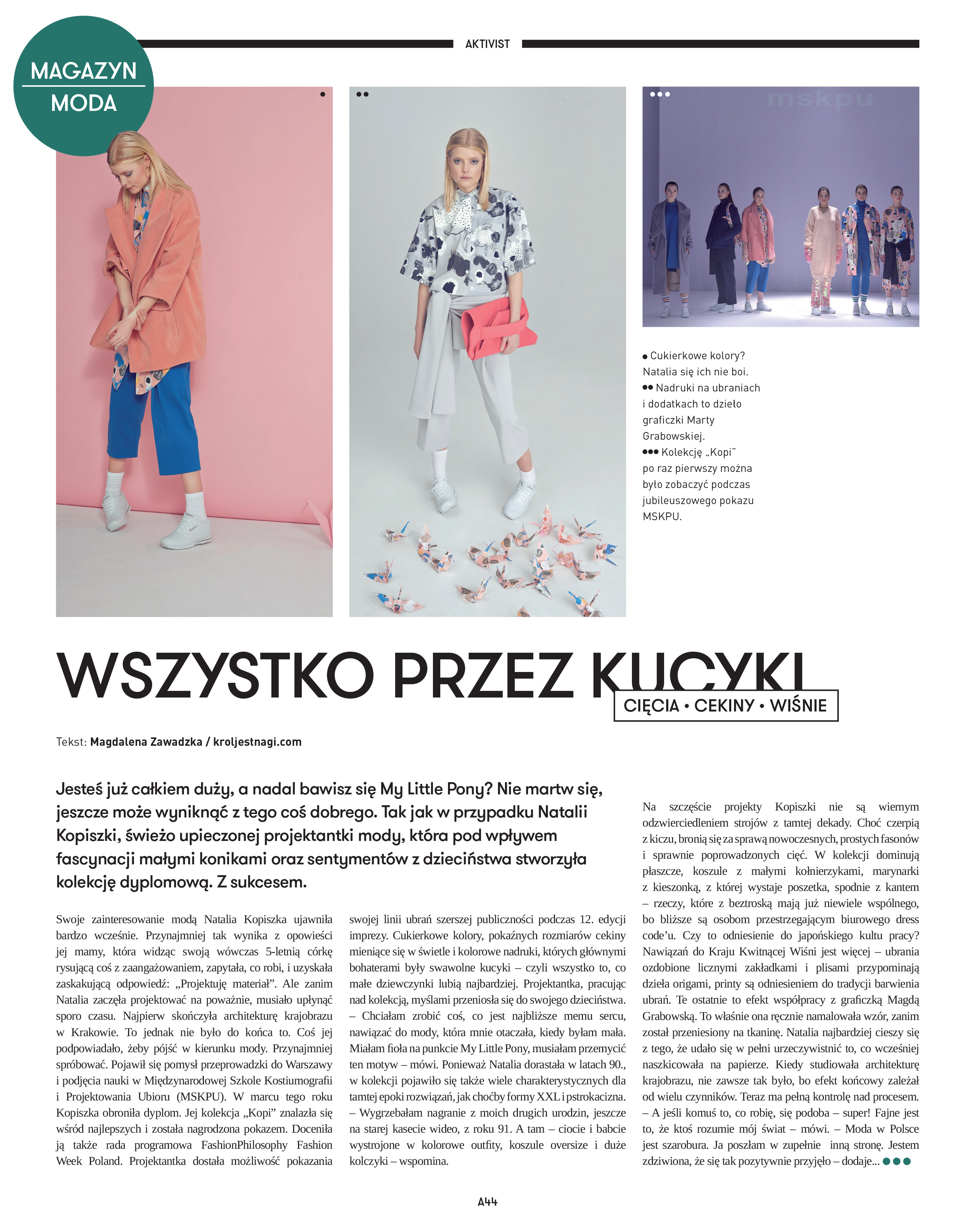 W majowym numerze magazynu Aktivist rozmawiam z Natalią Kopiszką. Jej kolekcja KOPI to bardzo udany debiut w polskiej modzie.