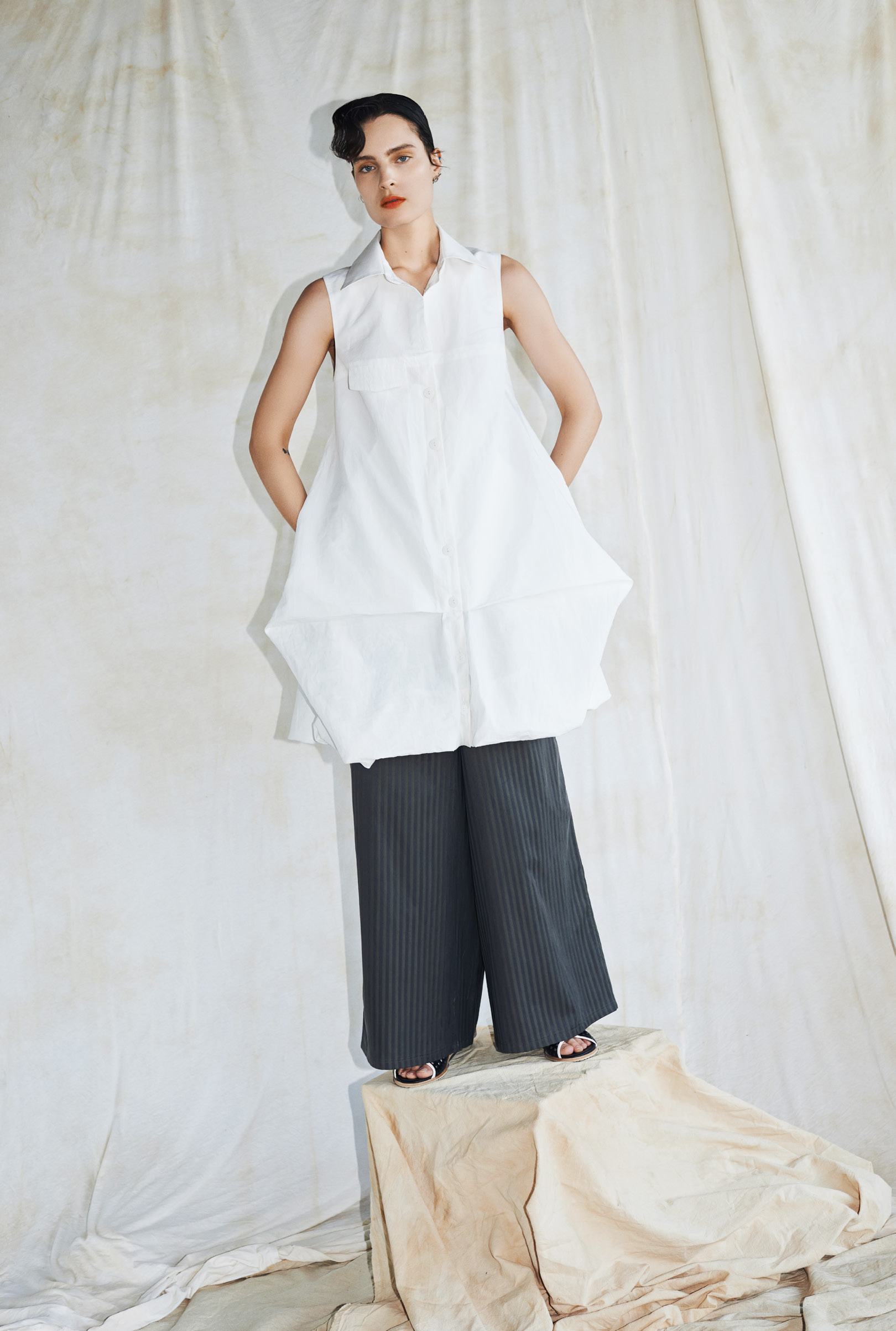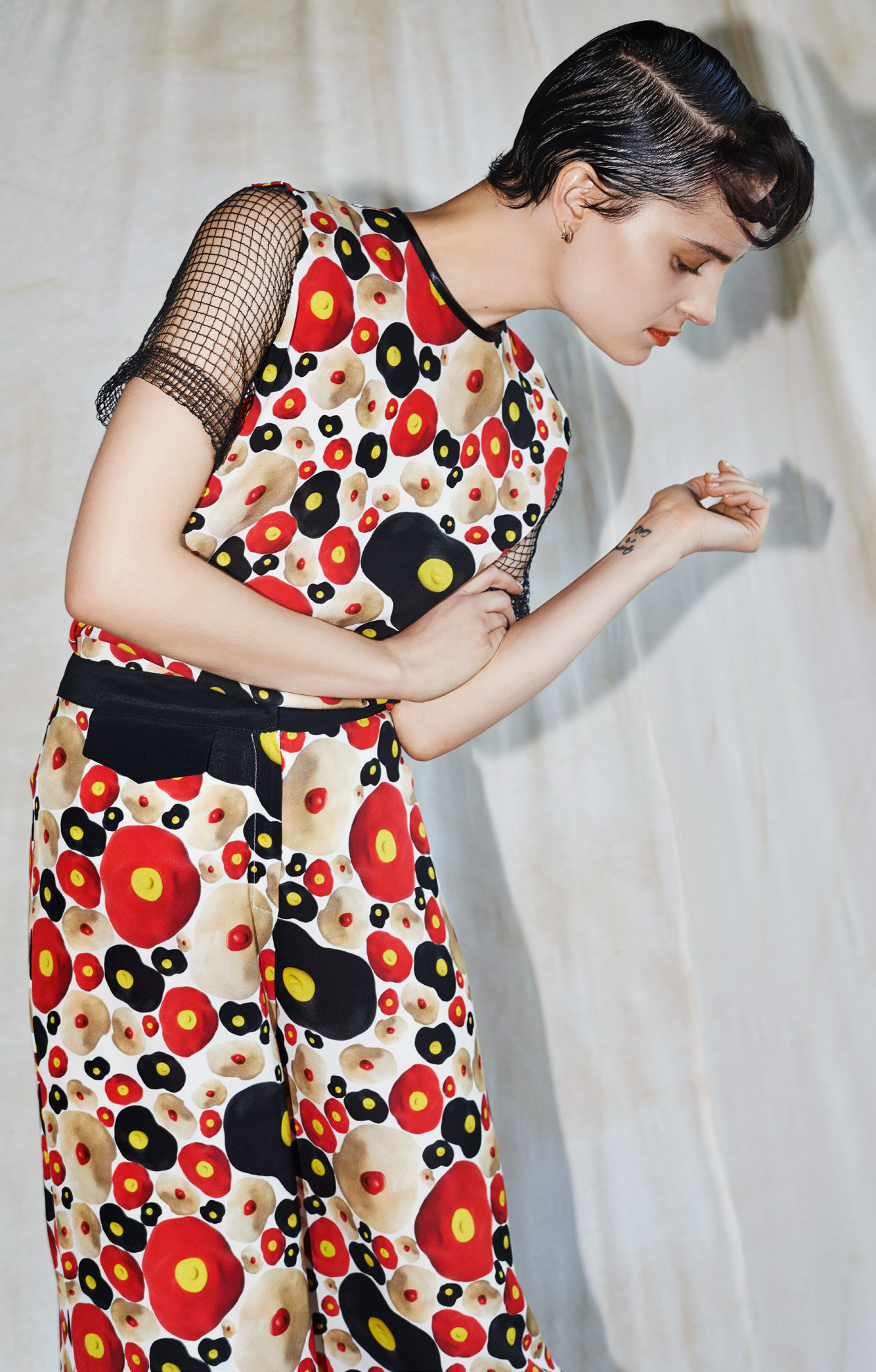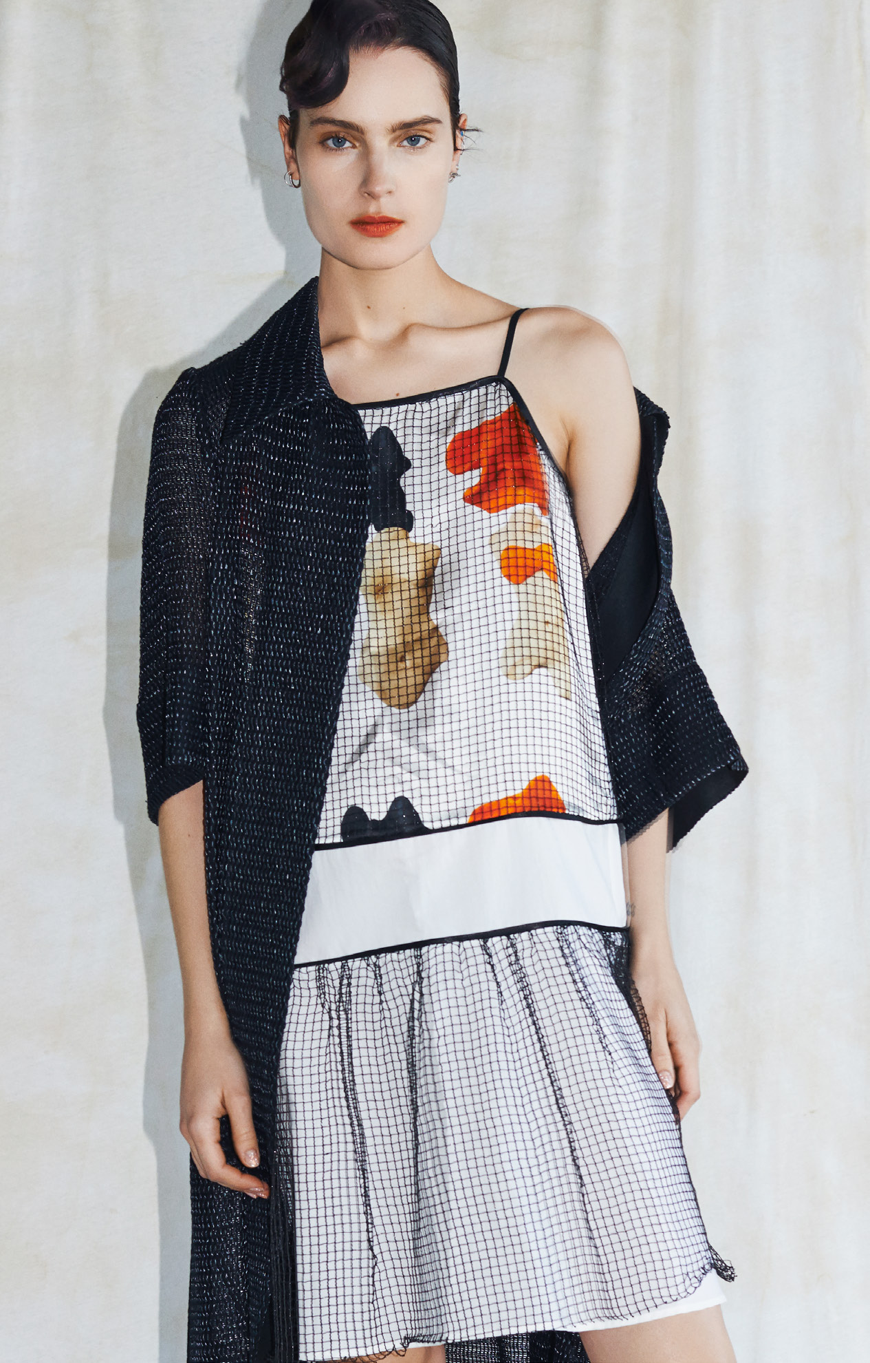 Najnowsza kolekcja – Sculptor Undone – nawiązuje do twórczości Aliny Szapocznikow (już sam tytuł odnosi się do jednej z wystaw rzeźbiarki). Stąd wyraziste nadruki w kształcie korpusów oraz piersi – powszechnych motywów w pracach artystki walczącej z chorobą nowotworową (rakiem piersi właśnie). A także rzeźbiarskie formy ubrań i ich struktura. Punktem wyjścia był ochronny kombinezon roboczy noszony przez rzeźbiarzy, na bazie którego powstały stroje do noszenia na co dzień, a nawet odważne kreacje wieczorowe. Obok nich pojawiają się wdzięczne i słodkie (zwłaszcza jak na Acephalę) dziewczęce sukieneczki mini (w odcieniu pudrowego różu i o bąbelkowej fakturze oraz biała w wydaniu baby doll przełamana za pomocą wyrazistej siatki), przypominające futra wdzianka z niezliczonej ilości flizelinowych pasków, szerokie spodnie i minimalistyczne spódnice. Doskonałym uzupełnieniem kolekcji są nonszalanckie kaszkiety w stylu Gavroche i sznurowane ażurowe buty z odkrytymi palcami. Oryginalne i intrygujące, ale i do noszenia!