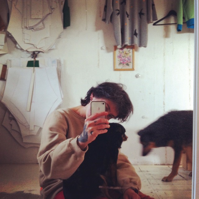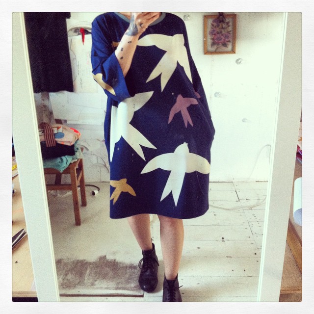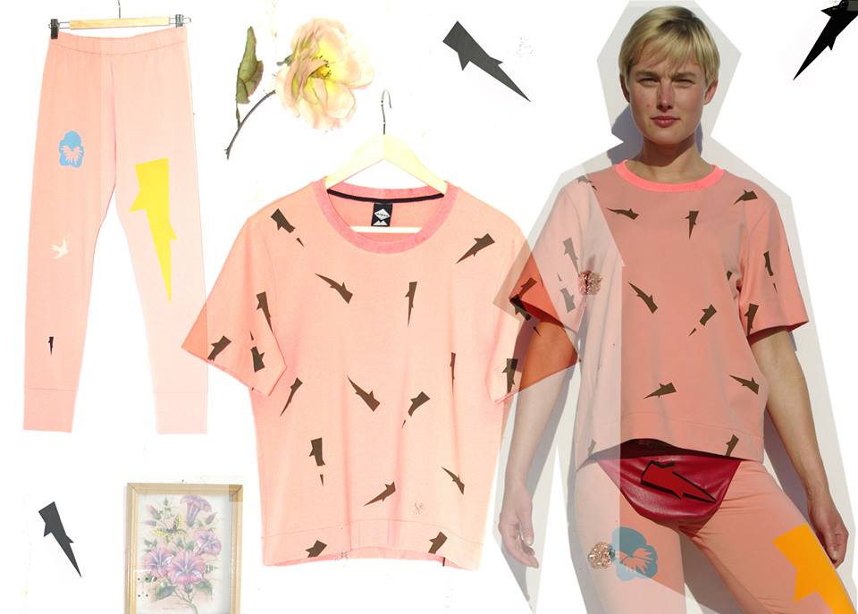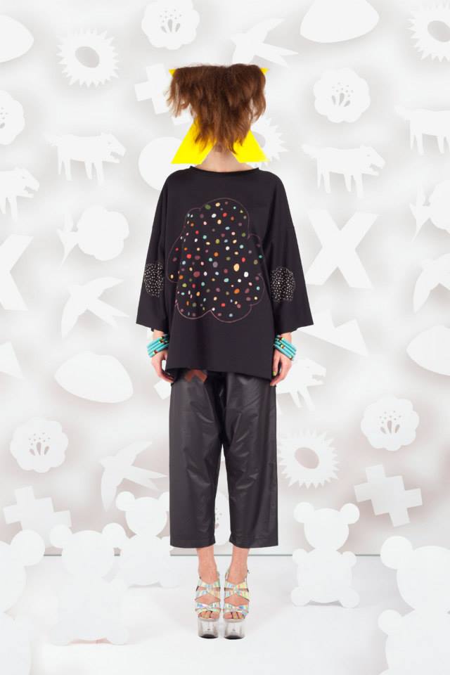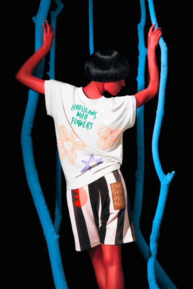 Iza na miejsce do życia i tworzenia wybrała wieś – Prokowo. Chciała odpocząć od miasta, mieć dużą pracownię i… wolność – móc słuchać muzyki o drugiej w nocy i zajadać warzywa z własnego ogródka. Wyciszyć się i wsłuchać w siebie (co jak zaznacza nie zawsze bywa przyjemne, ale na ogół wychodzi na dobre). I choć stąd wiele rzeczy jest załatwić trudniej, na razie nie wyobraża sobie życia bez natury. To właśnie ona stała się inspiracją debiutanckiej kolekcji projektantki. Po raz pierwszy Iza sięgnęła po charakterystyczne dziś dla jej projektów motywy: jaskółki, wilka, gałązki, kwiatu i twarzy. Bo Iza specjalizuje się w nadrukach – projektuje i drukuje je samodzielnie, bez użycia maszyn. Lubi za ich pomocą opowiadać historie, mówić o sobie i dzielić się tym, co widzi. A ponieważ wiele się za ich sprawą dzieje, formy ubrań pozostają proste. Najczęściej oversize. Iza śmieje się, że na takich jest przestrzeń na nadruk, ale lubi je też za to, że można się w nich schować i trochę się zapomnieć.